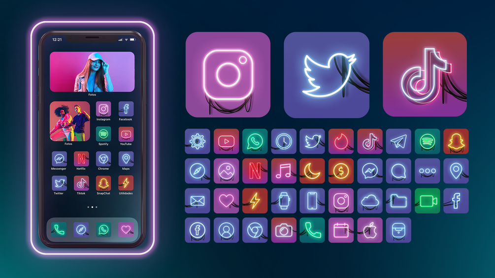Modern and attractive design, inspired by the neon signs of the city of Tokyo, to give more life and personality to our home screen of our iphone. Includes "Day Light Neon Icons Set" (38 icons), "Dark Night Neon Icons Set" (38 icons) and 3 wallpapers.